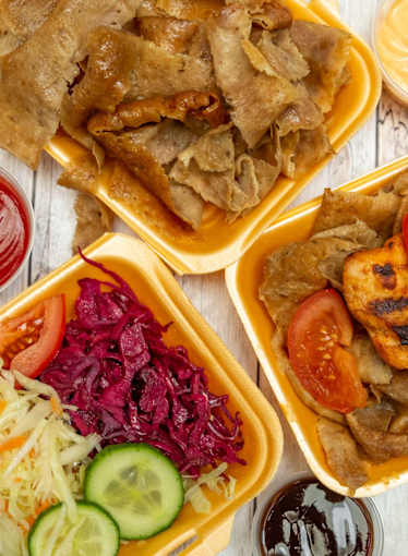 Chicken shish, chicken doner, lamb doner, lamb shish, kofte kebab, 2 salad, 2 pittas & 2 pots of sauce